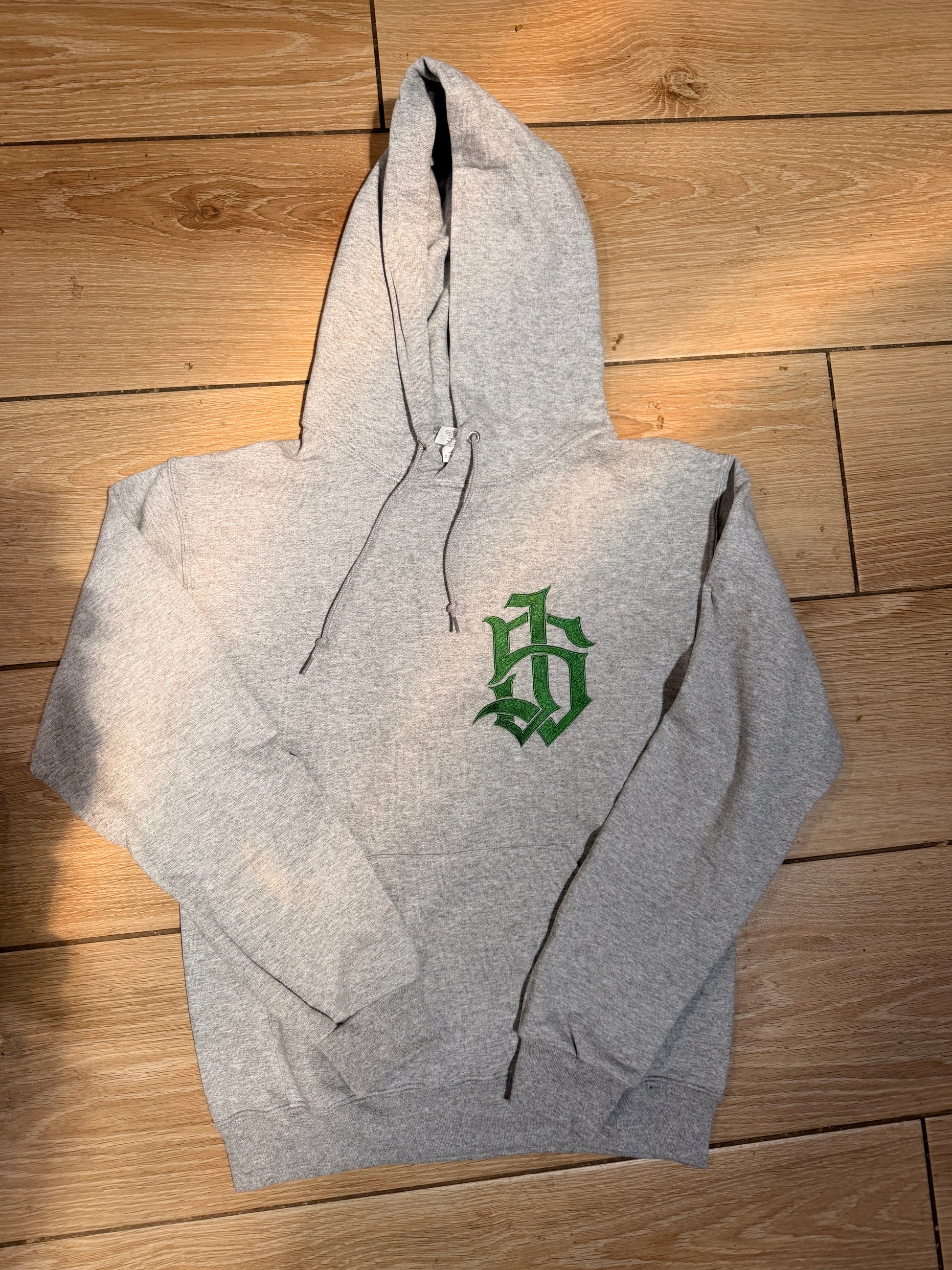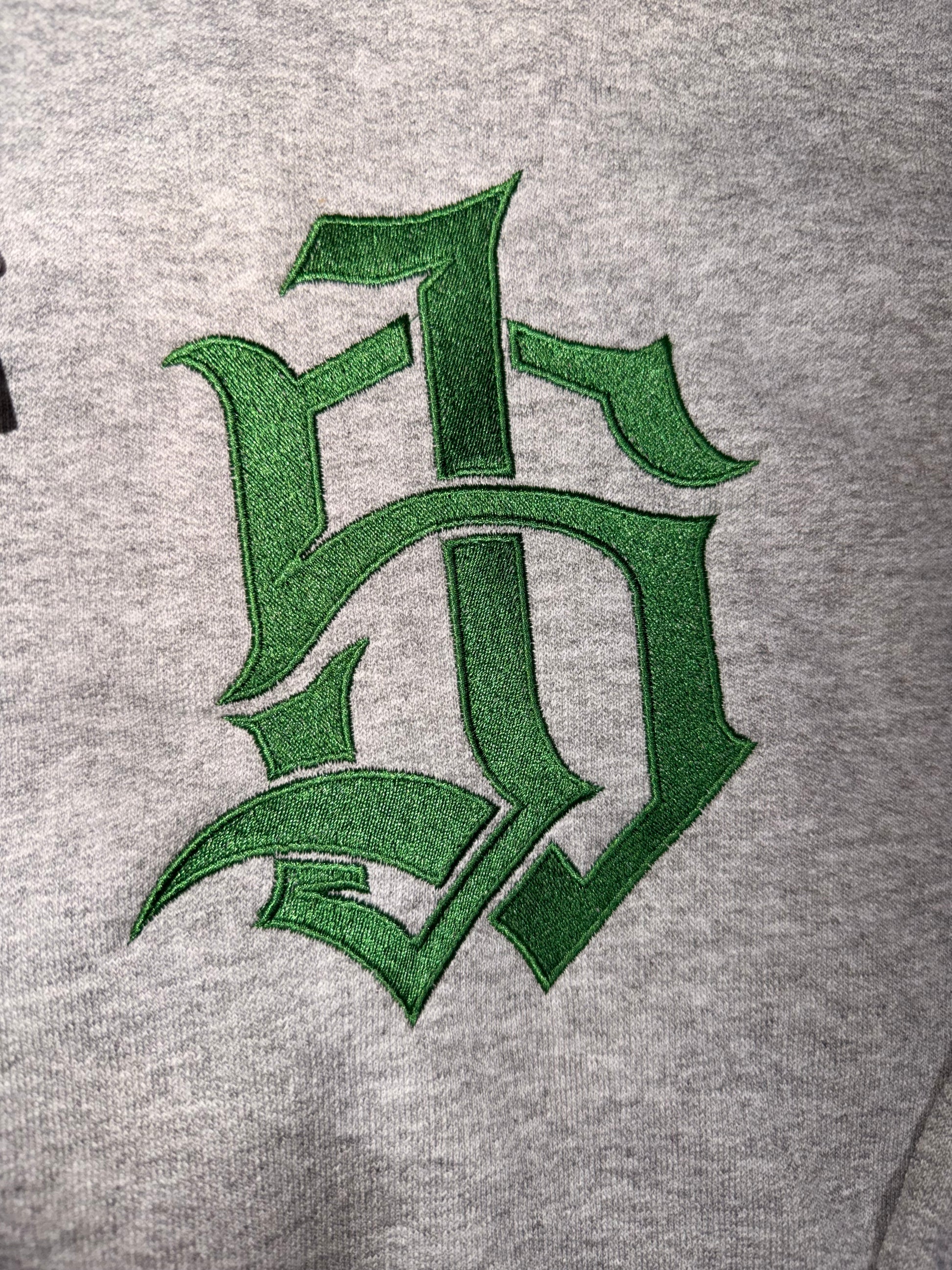 A timeless essential built with purpose. This heather grey hoodie features a bold embroidered Old English monogram in deep forest green — clean, sharp, and unapologetically classic.